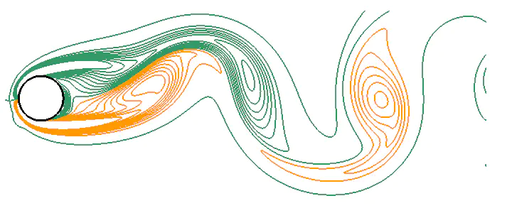 - Laterally oscillating cylinder with cross flow at $Re_D = 185$: isocontours of positive (orange) and negative (green) vorticity are presented to show the wake behind the cylinder.